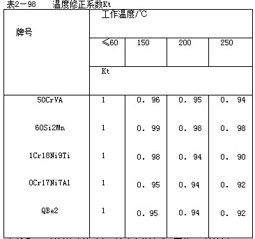 彈簧的工作溫度升高,彈簧材料的彈性模量下降,導(dǎo)致剛度下降,承載能力變小。因此,在高溫下工作的彈簧必須了解彈性模量的變化率(值),計算彈簧承載能力下降對使用性能的影響。按照GB1239規(guī)定,普通螺旋彈簧工作溫度超過60℃時,應(yīng)對切變模量進(jìn)行修正,其公式為:Gt=KtG 式中G——常溫下的彈性模量;Gt——工作溫度t下的切變模量;Kt——溫度修正系數(shù)按表2—98選取。